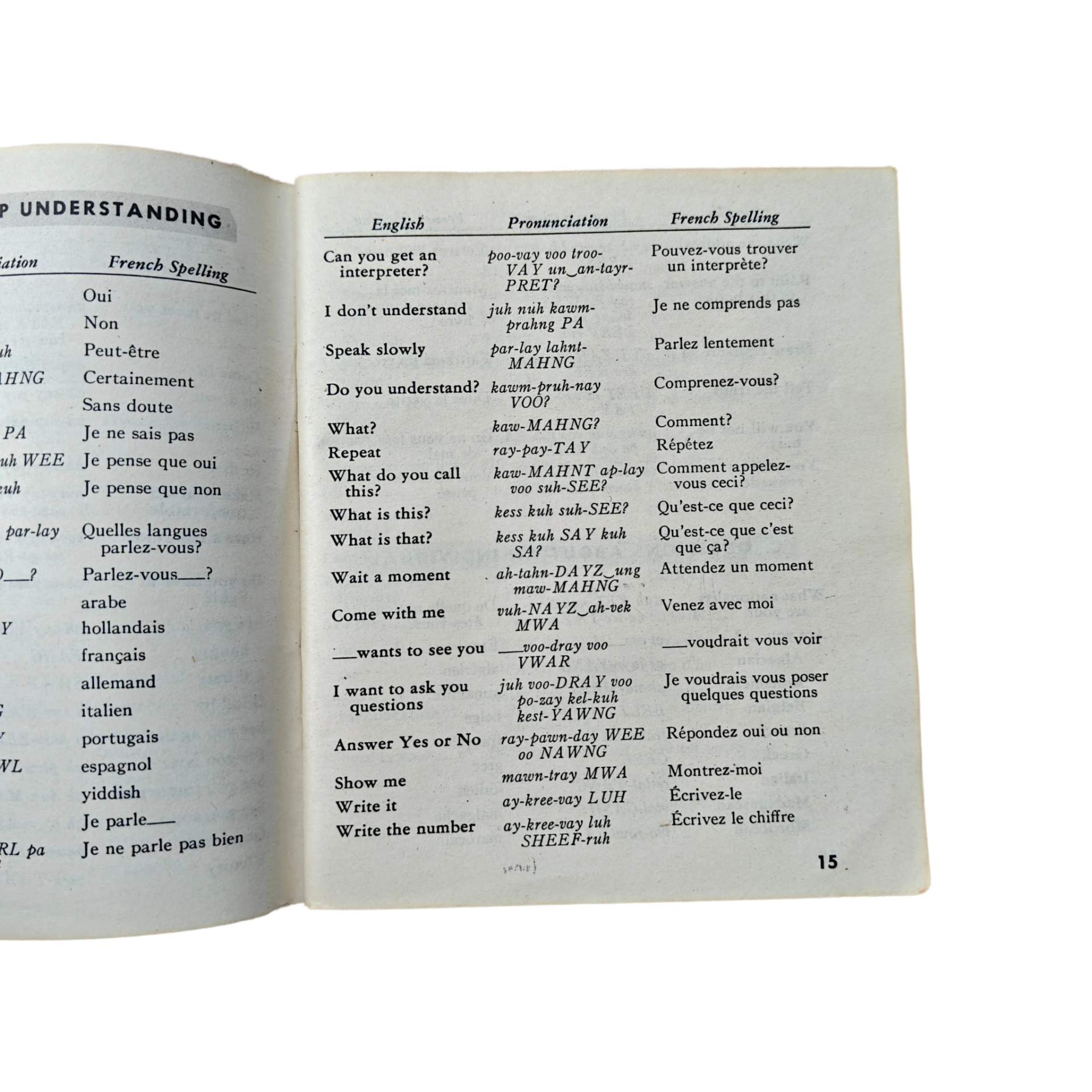 Het boekje is nog in nette staat en is 1944 gedateerd. Deze boekjes werden door de Amerikanen gebruikt om de taal te leren om zich enigsinds te kunnen redden in Europa. Een leuk en interessant item voor de militaria verzamelaar!