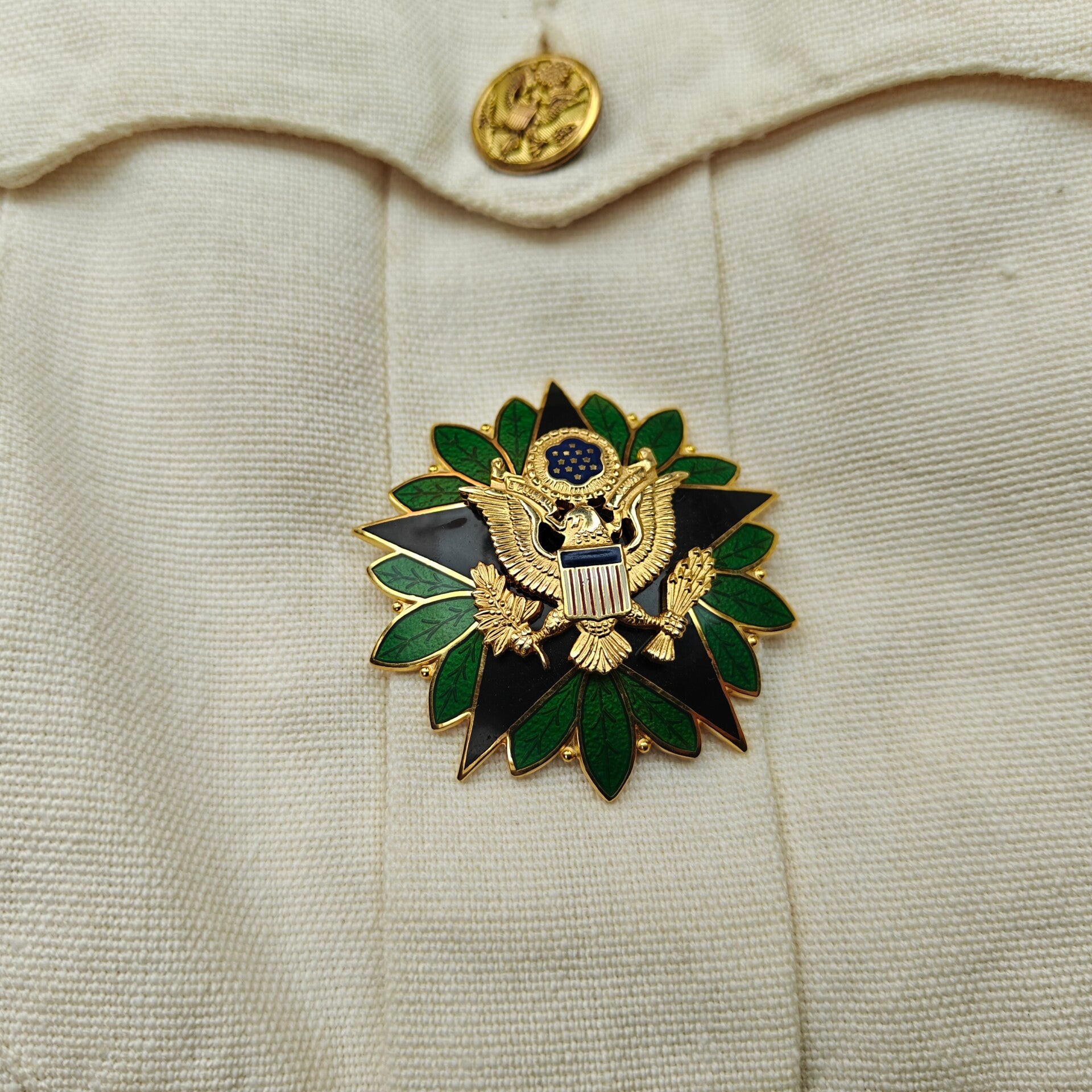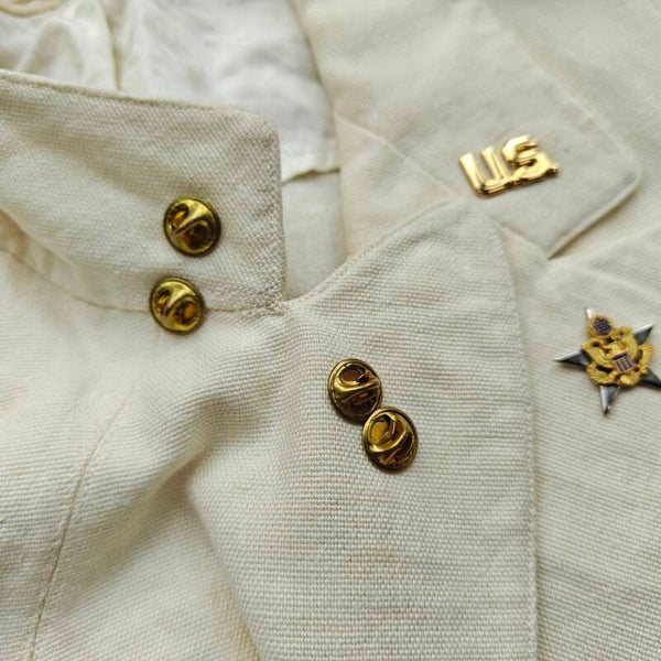 The coat is still in very good condition, apart from a few small spots. The coat belonged to an officer who was part of the American General Staff. There are Captain bars on the shoulder. On the collar are officer collar pins (Post-war production) and on the chest a General Staff Badge (Post-war production). A beautiful piece for the American collector!