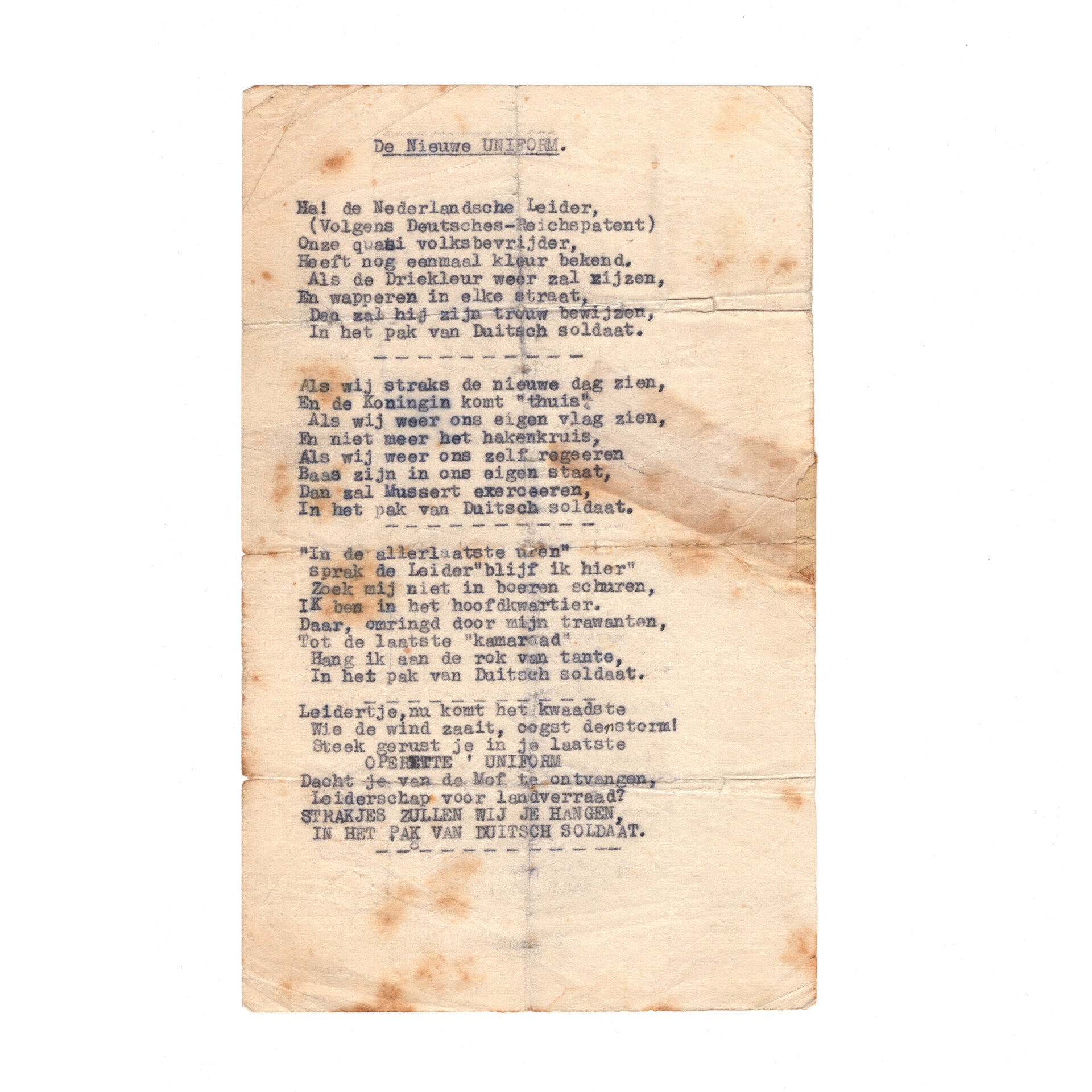 Dit document is vermoedelijk gedrukt door het Nederlandse verzet tijdens de Tweede Wereldoorlog. Een erg interessant en bijzonder stuk!