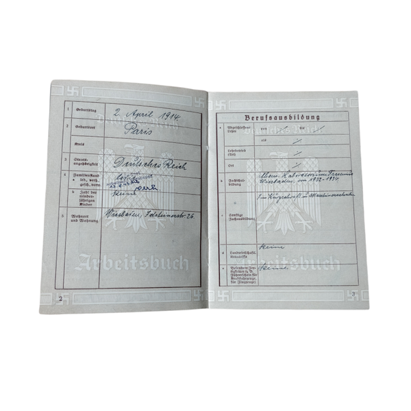 Het arbeitsbuch is erg bekend, het hoort thuis in elke collectie van de Duits verzamelaar. Uiteraard heeft het arbeitsbuch wat gebruikssporen. De eigenaar van het boekje is geboren in Parijs! Een interessante toevoeging aan de collectie!