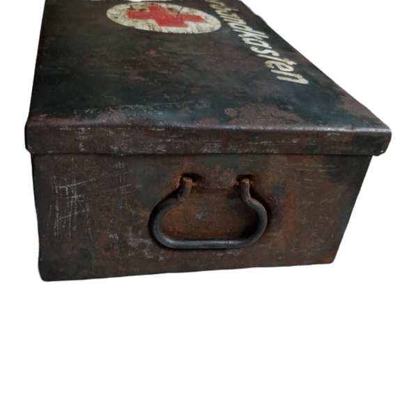 The verbandkasten is clearly in used condition, it has some rust and damage, the handle on the side is unfortunately stuck.