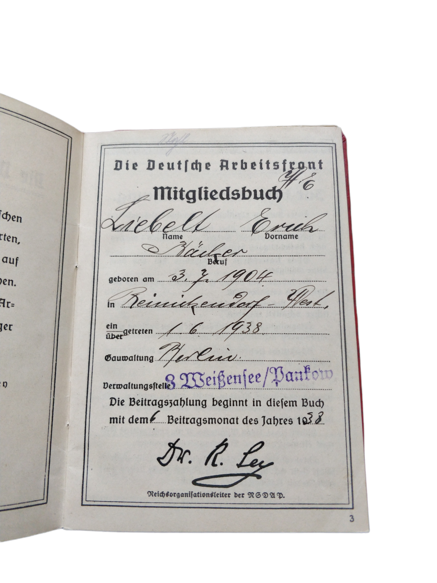 Het mitgliedsbuch verkeerd in goede conditie en heeft zelfs nog de sticker met naam aan de voorkant! Het is mooi ingevuld en perfect voor een Duitse collectie.
