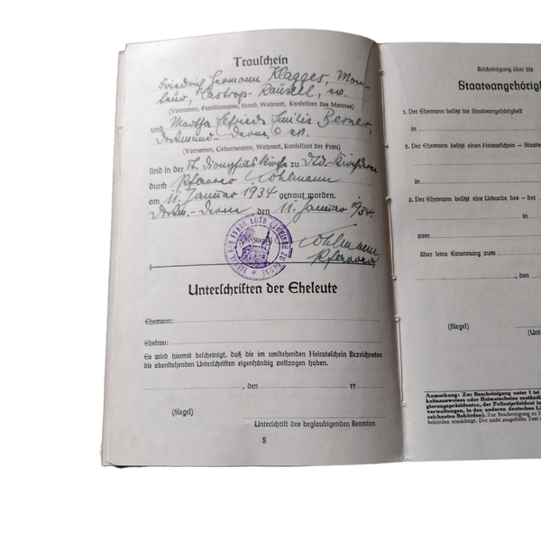 This booklet is still in neat condition but has its traces of use. These booklets were used in Germany to show that you were not of Jewish origin, very important for many Germans!