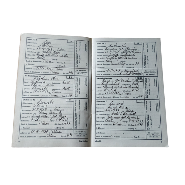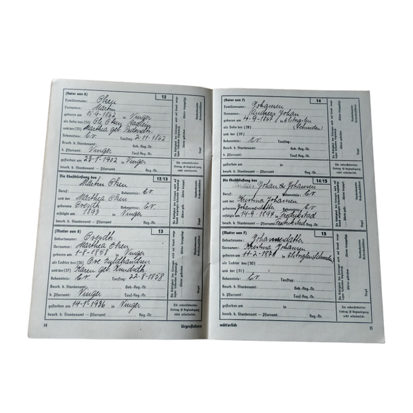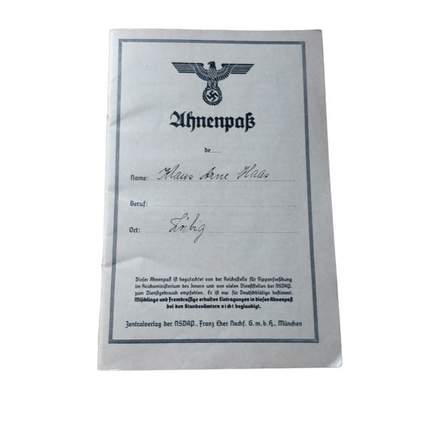 This booklet is still in neat condition but has its traces of use. These booklets were used in Germany to show that you were not of Jewish origin, very important for many Germans!
