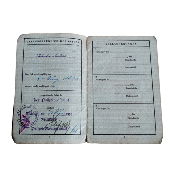 The travel pass has its traces of use. With this travel document, Germans could travel inland and abroad. The stamps show where the person went. An interesting addition to your collection! The cover has been repaired with tape.