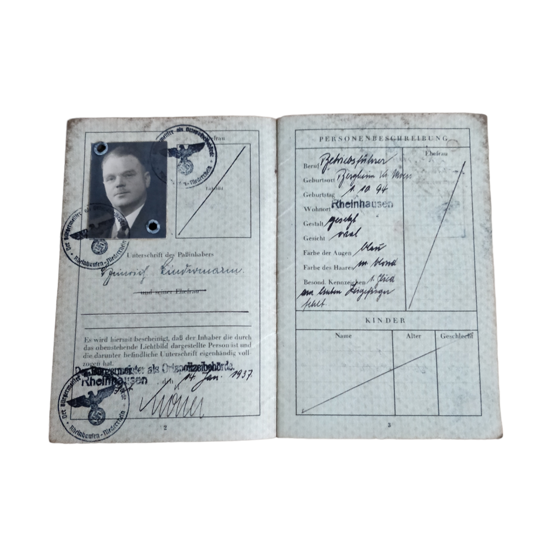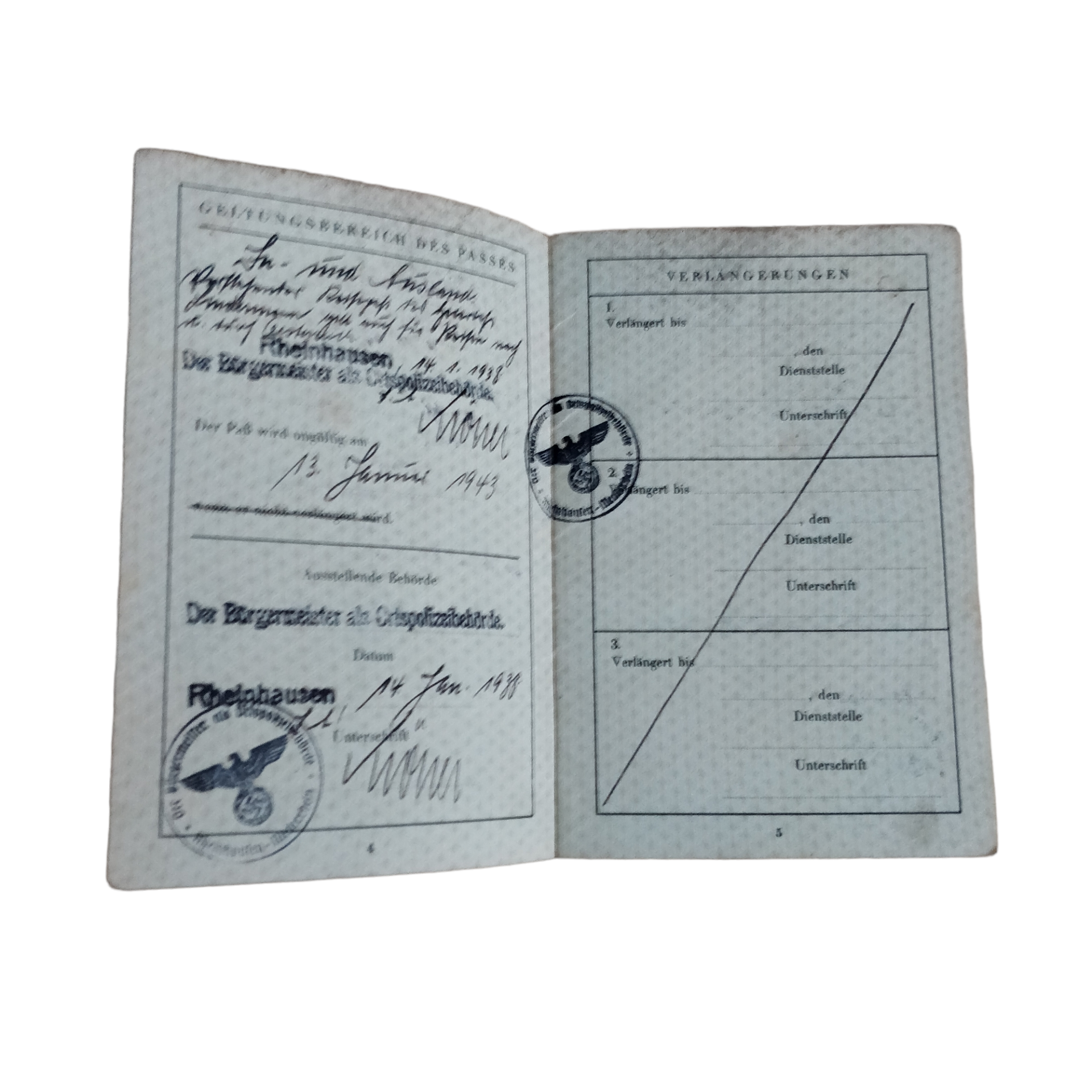 De reisepass heeft zo zijn gebruikssporen. Met dit reisdocument konden Duitsers reizen in binnenland en naar het buitenland. De stempels tonen aan waar de persoon allemaal heen ging. Een interessante toevoeging aan je collectie! Deze persoon is onder andere in Kerkrade in Nederland geweest!