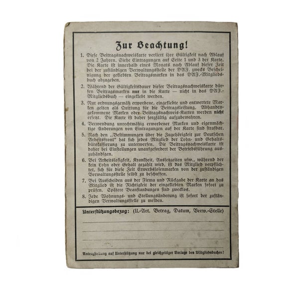 Dit document is op naam van Wilhelm praffcke en verkeerd in goede conditie. Op het document is te zien dat het mitgliedsbuch is beschadigd door een bombardement! Een erg bijzonder en uniek stuk voor je Duitse collectie.